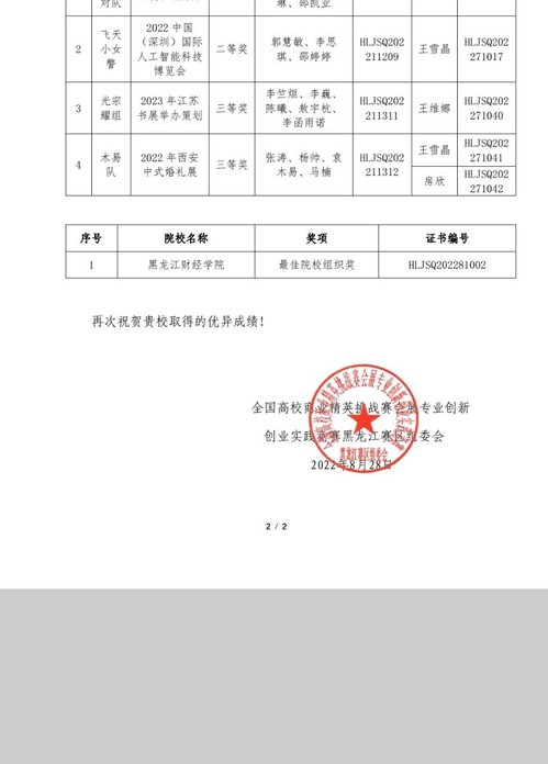 本次比赛会展经济与管理专业共有四支队伍参赛,经过激烈角逐,其中由20级会展经济与管理专业郭慧敏同学带队,邵婷婷同学和李思琪同学为队员的飞天小女警队伍荣获全省二等奖,由20级会展经济与管理专业张涛同学带队,袁木易同学、杨帅同学、马楠同学为队员的木易队荣获全省三等奖。并且,这两支队伍受大赛组委会推荐,成功晋级到国赛。