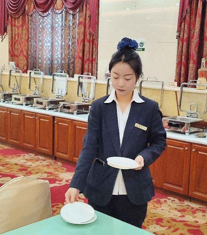 学生在餐饮部进行餐具摆台创新实践