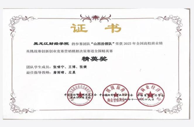 全国总决赛共有84支实力强劲的队伍成功晋级该项赛事的全国精英赛。我校由詹雨晴、左晨老师指导的“山西汾酒队”于11月28日赴山东省泰安市泰山科技学院参加全国精英赛。面对来自全国各地的顶尖参赛队伍,团队成员凭借着自己的实力与对商业环境的敏锐感知,沉着应战、精益求精,充分发挥在营销策划、数据分析、决策执行等方面的优势,紧密围绕赛事要求展开深度研讨与方案优化,展现出扎实的专业素养、出色的创新思维和极强的实践能力。经过多轮紧张激烈的比拼,最终凭借优异的综合表现斩获全国精英奖,充分彰显了龙财学子在营销专业知识与实操能力方面的过硬实力和学校营销理论教育与实战训练相结合的丰硕成果。这也是我校学生在该赛道获得过的最好成绩。